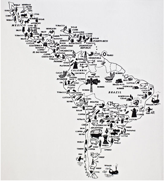 La portada del estudio Ficciones Capitales de Ericka Beckman dice mucho. Esta consiste en un mapa de lo que habitualmente llamamos Latinoamérica poblado no por ciudades ni formaciones geológicas sino por las mercancías que cada país representa en el imaginario economista norteamericano: cada país alberga materias primas caricaturizadas, algo familiares e inofensivas, que definen su rol dentro de un sistema de mercado global. En el estudio hay que notar varias cosas. La primera, como Beckman muy bien lo recuerda, es la reducción de cada territorio a productos primarios apetecidos por el norte industrializado, granos, minerales, frutas, vegetales, maderas, producción de carne, de frutos de mar, de petróleo, de estimulantes como el café y el tabaco, etc. De alguna manera, todos los componentes del mapa nos dicen más sobre el arquitecto que diseñó este plano que sobre lo que propone representar. En este sentido el continente esta imaginado como una colección de materias primarias listas y expectantes al arribo de la maquinaria procesadora que va a convertirlas en zapatos italianos, sombreros de copa y energía para las demandas militaristas del norte. Es decir, la vida en el sentido amplio del continente ha sido plasmada en un plano a seguir y solo espera la pacifica extracción y procesamiento para su transformación. La segunda inquietud aquí es que nunca se cuestiona la premisa consumista y la fetichizacion de la mercancía del capitalista ismo, en específico en capitalismo de monopolio y las teorías desarrollistas que acompañaban estos modelos.